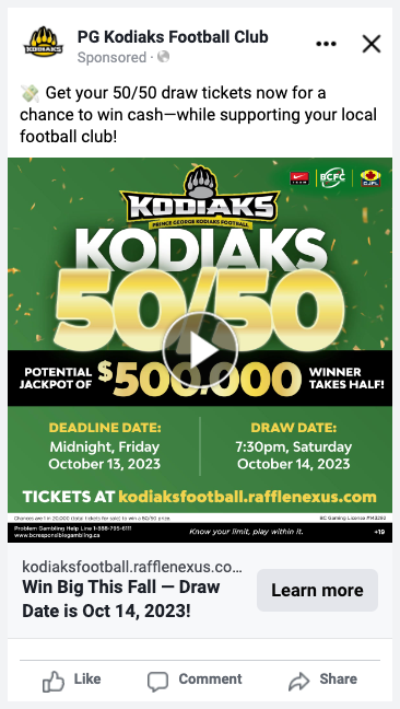 Client wanted to promote their 50/50 draw which could reach beyond Prince George. Took additional time to launch as META has a tricky approval process for lottery.